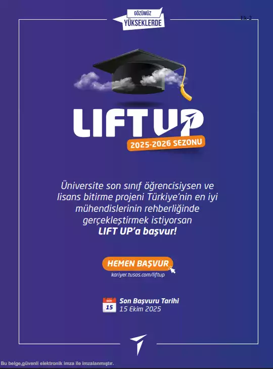 TUSAŞ LIFT UP Sanayi Odaklı Lisans Bitirme Projeleri Programı kapsamında, 2025-2026 dönemi başvuruları 15 Ekim 2025 tarihine kadar https://liftup.tusas.com
